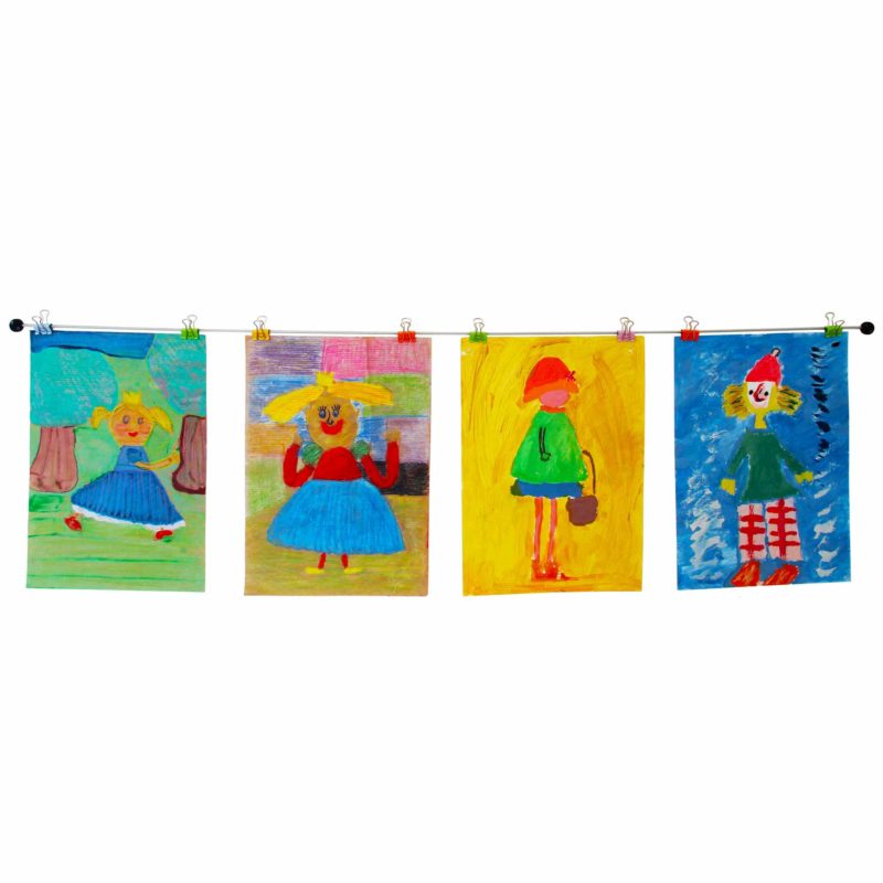 Das Fotoseil haben wir extra so konzipiert, damit Du mühelos Fotos, Postkarten, Kinderbilder und Kinderzeichnungen an den Wänden aufhängen kannst. Das Fotoseil bestehend aus einem dünnen Metalldraht hat an den Enden Seilhalter, welche Dir die Wandmontage erleichtern. Denn für die Befestigungen des Fotoseiles benötigst Du lediglich einen Hammer, die Nägel sind bereits dabei. Sobald das Fotoseil an der Wand hängt kannst Di die Fotos oder die Kinderbilder mit den kunterbunten Metallclips an dem Fotoseil aufhängen. Die Clips ähneln in der Funktionsweise normalen Wäscheklammern, sind jedoch viel stärker und bieten somit auch für besonders große Kinderzeichnungen festen Halt. Due kannst die Kinderbilder so oft wie Du möchtest tauschen und die Bilder werden hierbei nicht beschädigt. Auf diese Weise kannst Du die Kunstwerke Deiner Kinder gekonnt und effektiv immer wieder in Szene setzen.