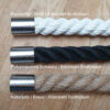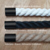 Eine Vielzahl von verschiedenen Seilmaterialien (Naturjute, Kunsthanf, Baumwolle und Polypropylen) und Farben (Braun, Weiß, Schwarz, Rot, Blau) stehen Dir zur Auswahl. Alle Seile haben einen Durchmesser von 24 mm und sind oben und unten jeweils mit einer Metallhülse aus Edelstahl abgeschlossen. Die Metallhülsen sind in den Varianten Edelstahl gebürstet und Edelstahl schwarz pulverbeschichtet verfügbar.